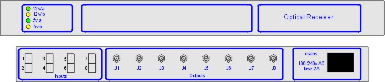 A Range of units for receiving RF over fibre and outputting RF on Coax. Choice of 1 to 8 receivers in a 1U enclosure. Optical power max +8dB Wavelength 1260 - 1620nm Optical connectors SC/APC, FC/APC, LC/UPC or SC/UPC RF connectors 50 ohm SMA or 75 ohm BNC or F type Single or dual Power Supplies Optical and RF Connectors and Mains inlet on front or rear panel to suit rack wiring Optional RF monitor ports Optional Spectrum analyser . Signals can be monitored